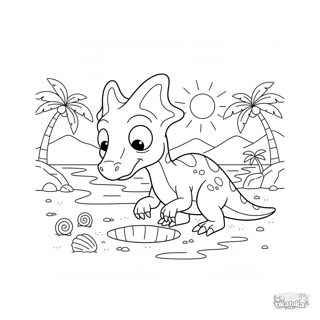 Ausmalbild für Kinder von 4-6 Jahren: Ein Dilophosaurus gräbt konzentriert ein Loch in den Sand eines urzeitlichen Strandes, um Muscheln zu finden.