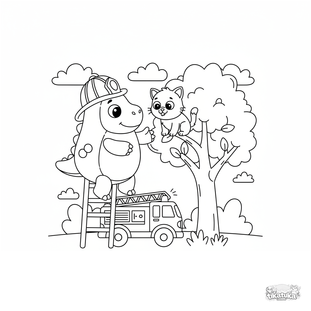 Ausmalbild für Kinder 4-6: Der Dino-Forscher-Held mit Feuerwehrhelm klettert eine Baumleiter hoch, um ein ängstliches Kätzchen zu retten, ein Feuerwehrauto wartet unten.