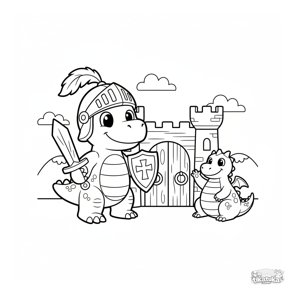 Ausmalbild eines Dino-Entdecker-Ritters, der mutig vor einer Burg und einem freundlichen Drachen steht. Für Kinder von 4 bis 6 Jahren.