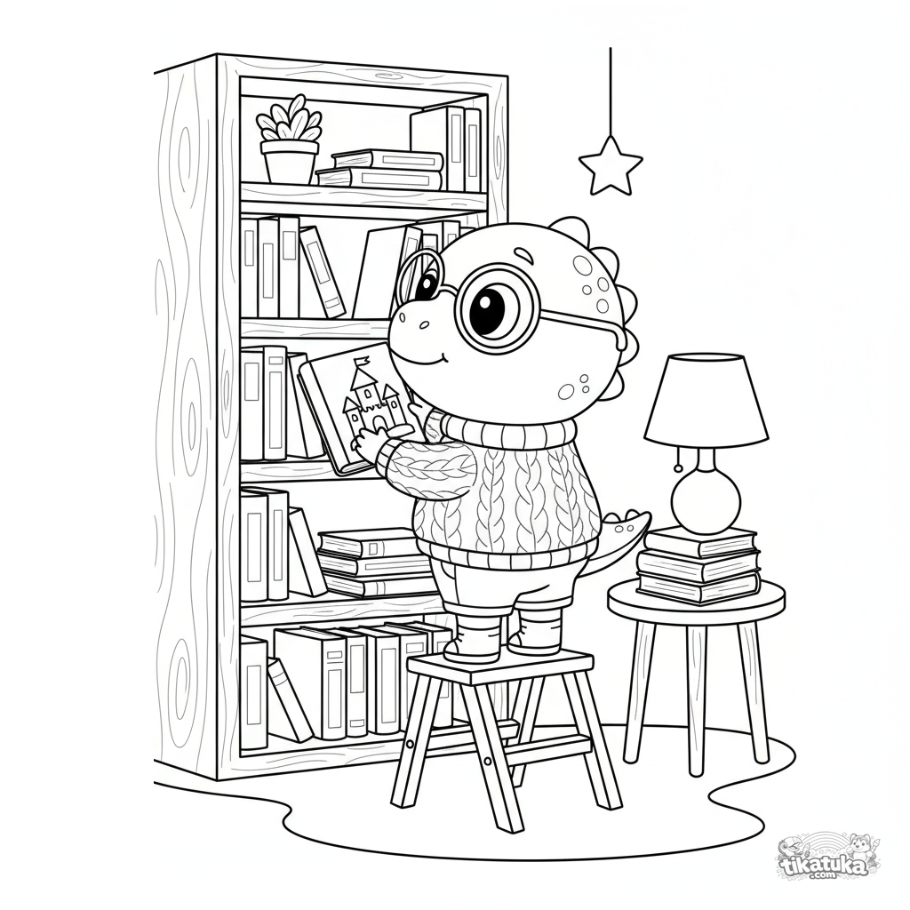 Ausmalbild für Kinder 5-9: Der Dino-Forscher-Held trägt eine Brille und arbeitet als Bibliothekar, der sorgfältig Bücher in einer gemütlichen Bibliothek einräumt.