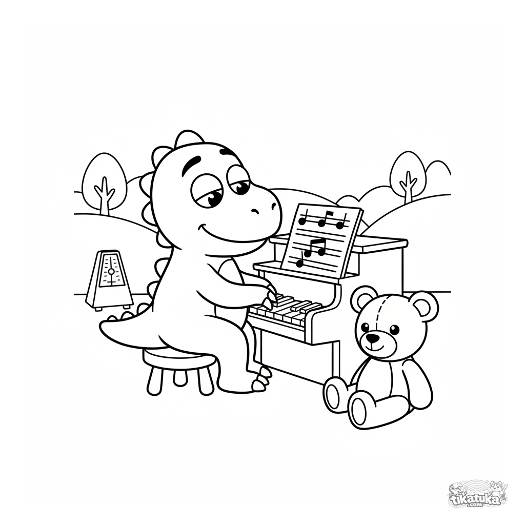 Ausmalbild für Kinder 4-8: Der Dino-Forscher-Held lernt, ein Spielzeugklavier zu spielen, und schaut sich sorgfältig ein Blatt mit einfachen Noten an.