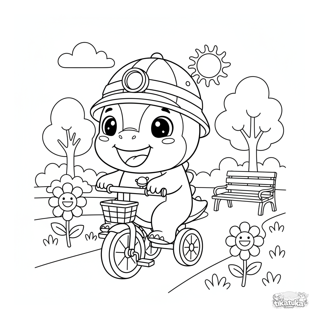 Ausmalbild für Kinder 4-6: Dino-Entdecker mit Helm fährt fröhlich ein rotes Dreirad auf einem Parkweg. Schwarz-weiße Umrisszeichnung zum Ausmalen.