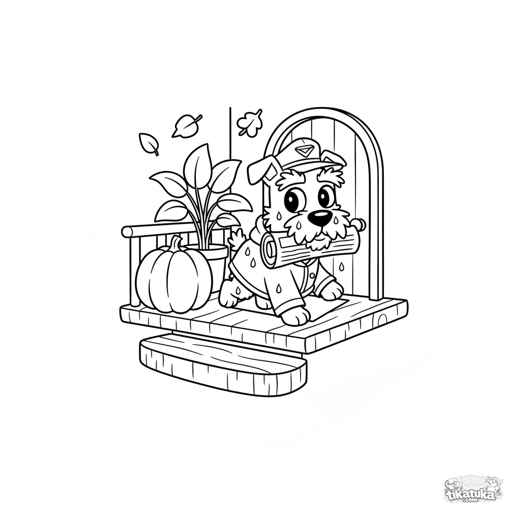 Ausmalbild für Kinder (7-9 Jahre): ein fröhlicher Hund in Regenmantel und Mütze liefert eine Zeitung auf einer Veranda an einem regnerischen Herbstmorgen. Dynamische Pose.