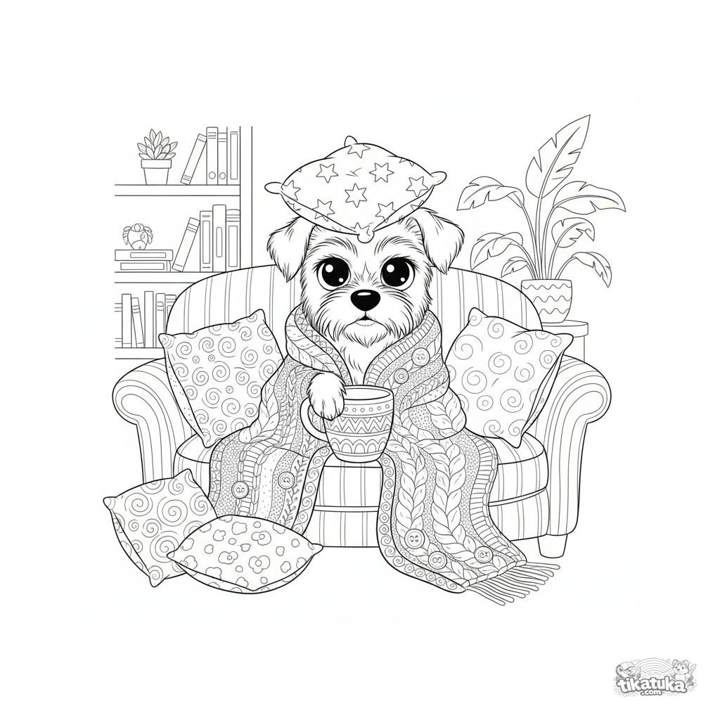 Ausmalbild für Kinder von 7 bis 12 Jahren: Ein kleiner Hund ist lustig in einer Decke auf dem Wohnzimmersofa verheddert. Chaotische und lustige Misserfolgsszene.