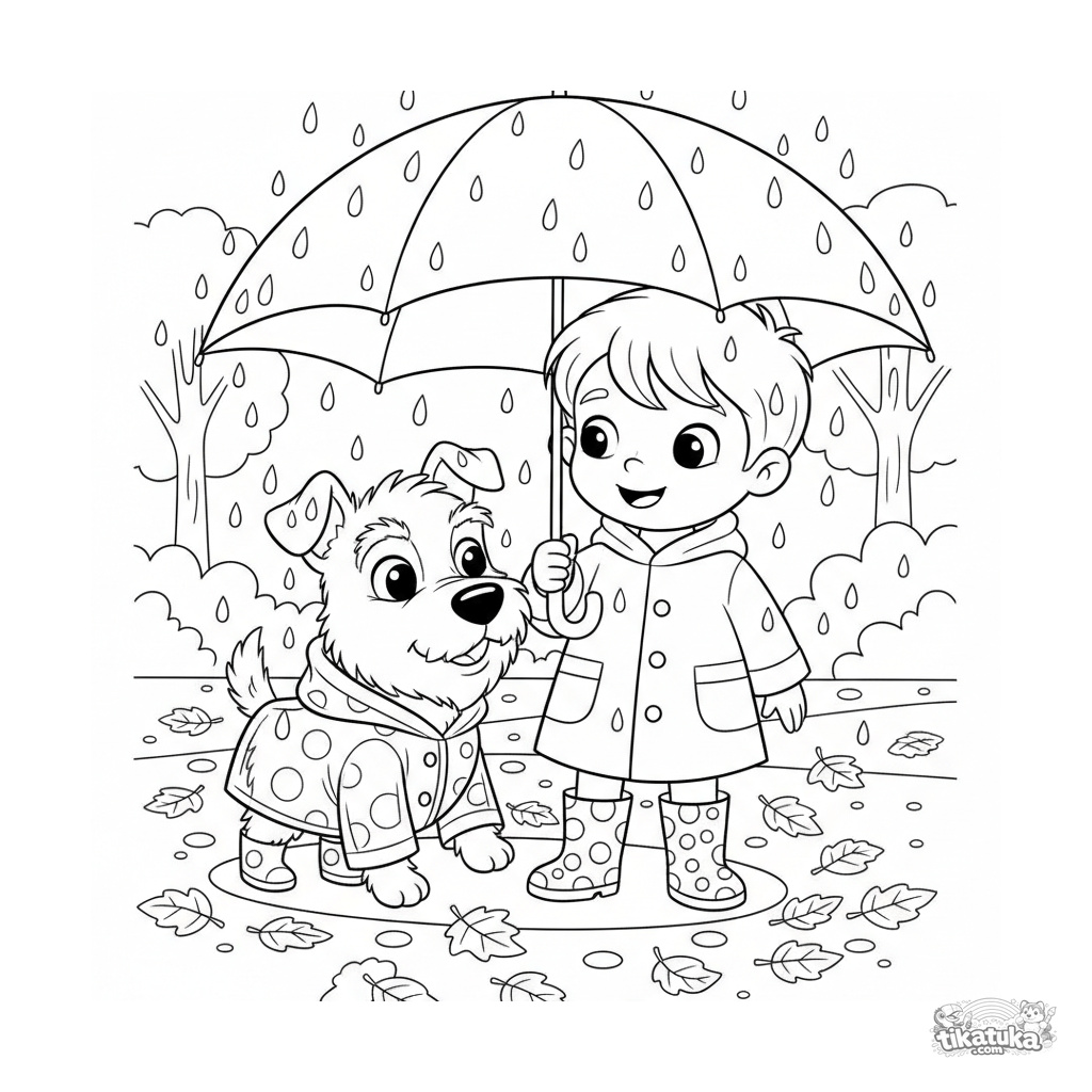 Detailliertes Ausmalbild für ältere Kinder 10-12 Jahre: ein flauschiger Terrier im transparenten Regenmantel und Stiefeln geht mit einem Kind unter einem Regenschirm in einem Herbstpark spazieren. Eine rührende Szene der Freundschaft und des Herbstwetters.