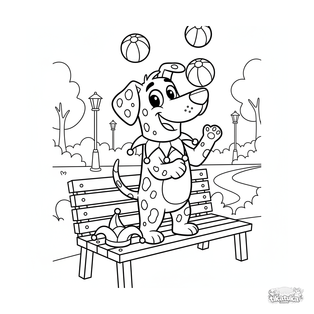 Ausmalbild für Kinder 4-6: Ein verspielter gefleckter Hund jongliert mit Bällen auf einer Parkbank. Dynamische und lustige Szene.