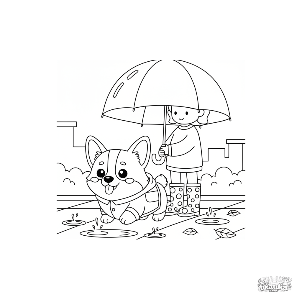 Ausmalbild für Kinder 4-6 Jahre: ein flauschiger Corgi in einer Regenjacke spaziert mit seinem Besitzer unter einem großen Regenschirm an einem regnerischen Herbsttag.