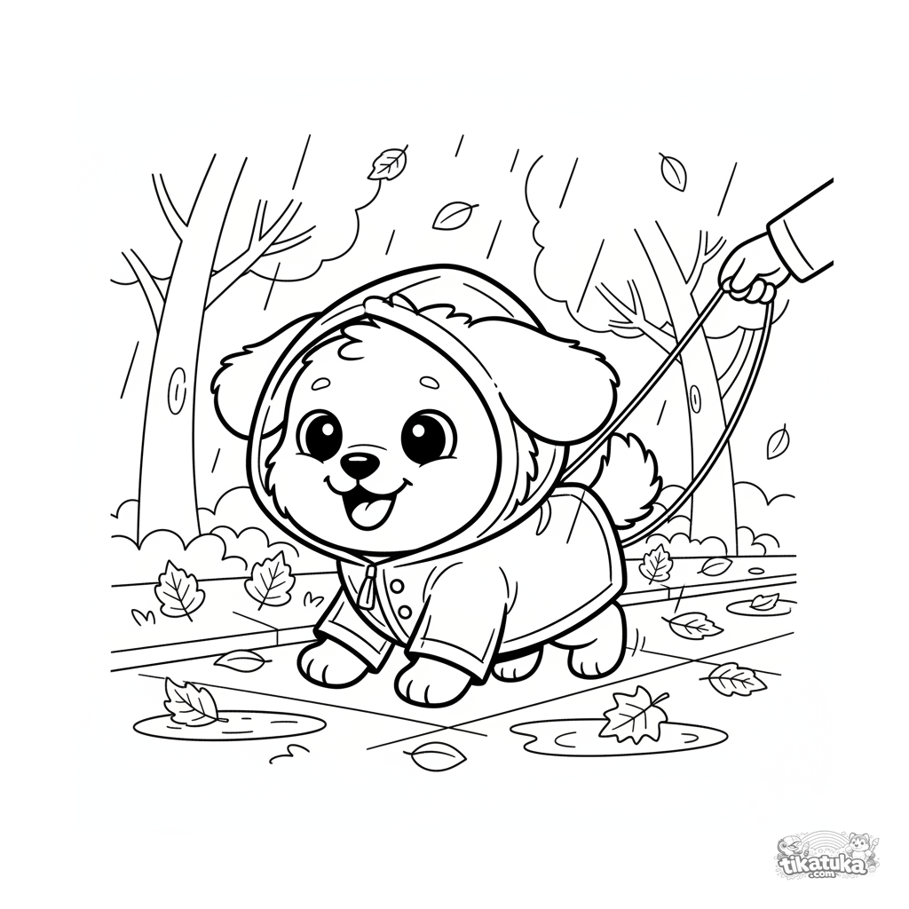 Ausmalbild für Kinder 4-6 Jahre: ein flauschiger Hund im transparenten Regenmantel läuft an einem regnerischen Herbsttag. Mäßiges Detail, klare Formen.