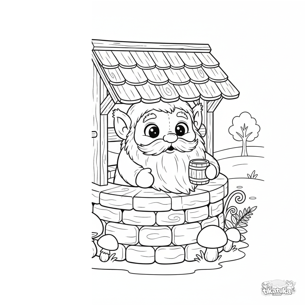 Ausmalbild für Kinder 4-6: Ein freundlicher Domovoy-Wächtergeist lugt hinter dem Brunnen des lebendigen Wassers hervor. Weiche Plüschformen, niedlicher Ausdruck.