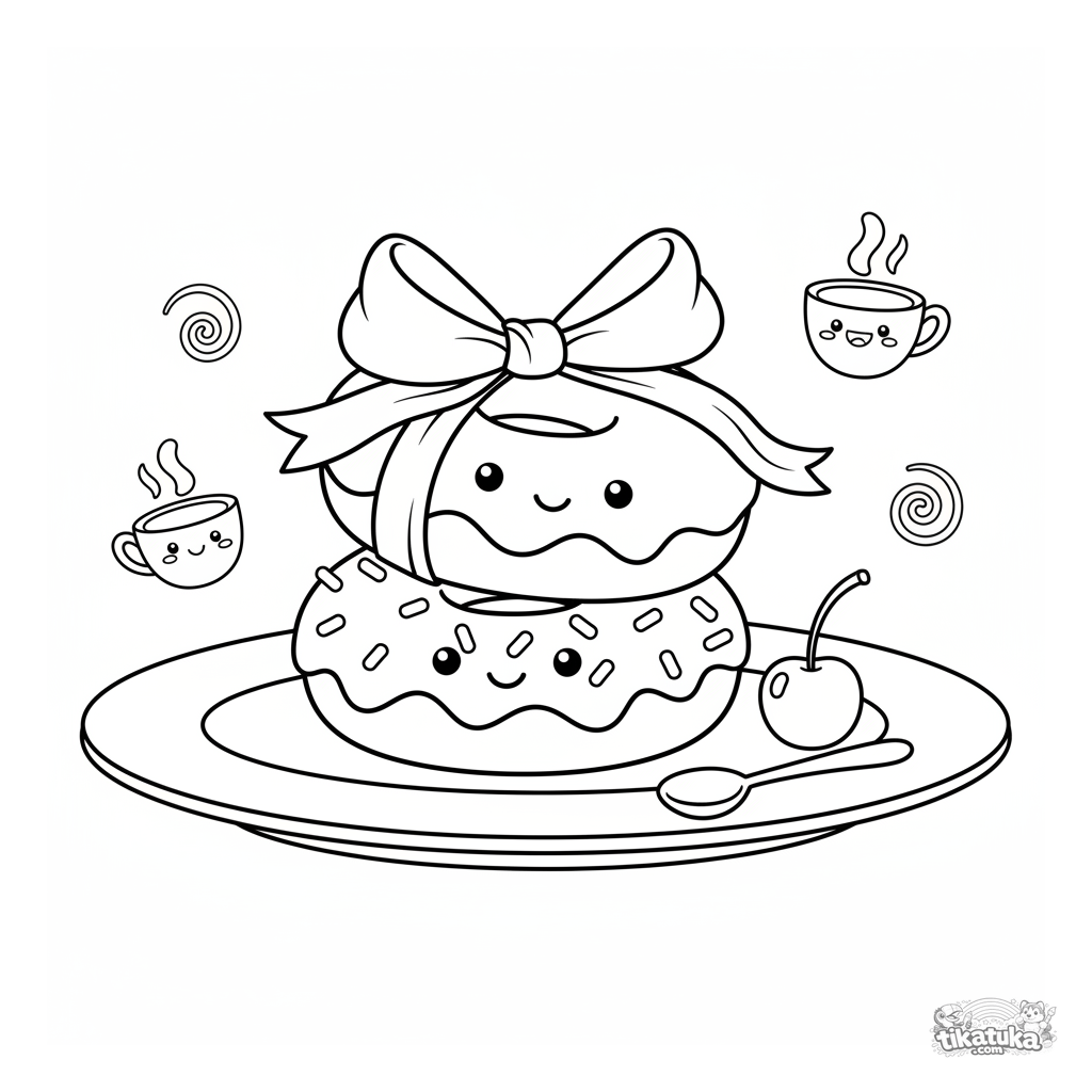 Ausmalbild für Kinder: Ein süßes Donut-Duo balanciert auf einem Dessert-Teller übereinander. Lustige Szene für Kinder im Alter von 4-6 Jahren.