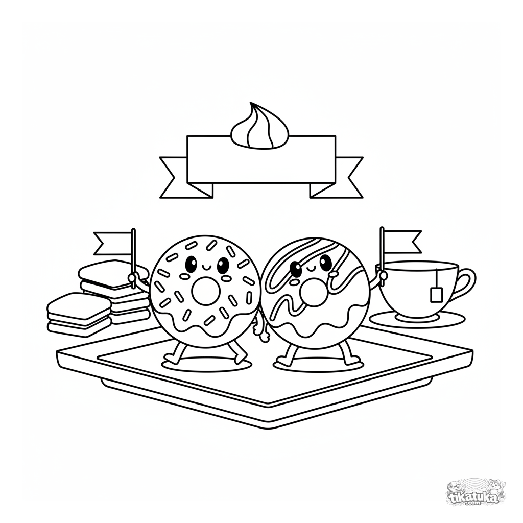 Ausmalbild eines Donut-Duos, das auf einem Dessertteller marschiert. Für Kinder von 4-6 Jahren. Mit Streuseln, Glasur, kleinen Fähnchen und einem Zuckerguss-Banner.