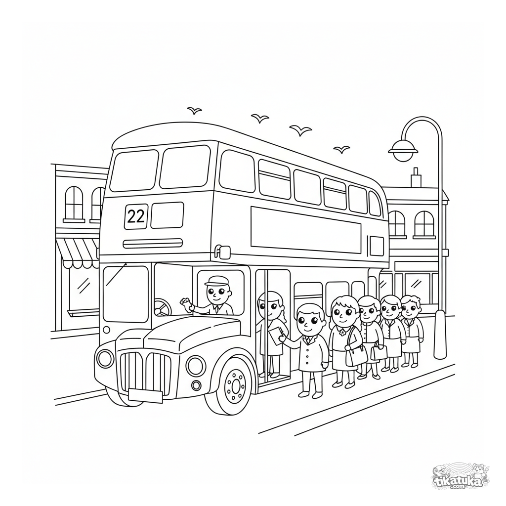 Ausmalbild für Kinder: ein berühmter Doppeldeckerbus an einer Haltestelle, Passagiere steigen ein. Details: offenes Oberdeck, Liniennummer, Schaffner.
