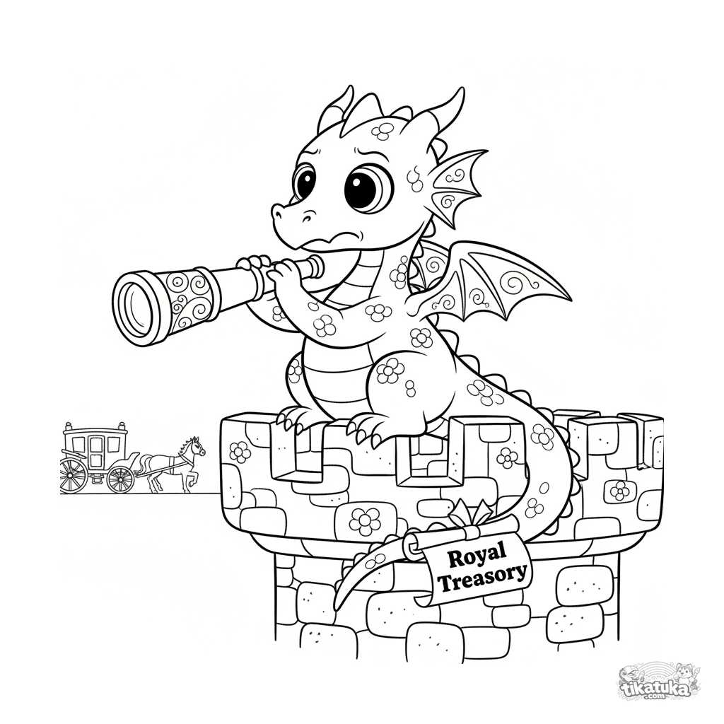 Ausmalbild für Kinder 10-12: Ein besorgter kleiner Drache auf einer Burgmauer mit Fernrohr, auf der Suche nach der Postkutsche mit seinem Königssold. Detaillierte Märchenszene.
