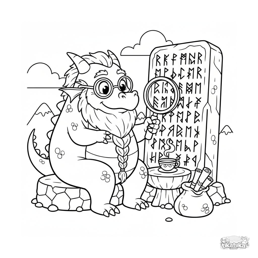 Ausmalbild für Kinder 4-6 Jahre: Ein weiser Drache mit Brille studiert alte Runen auf einem riesigen Monolithen.