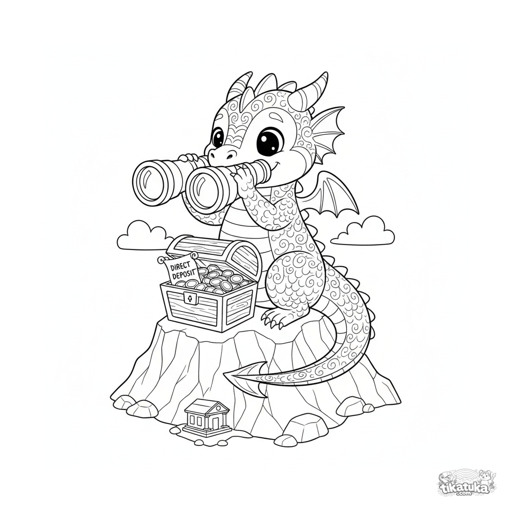 Ausmalbild für Kinder 10-12: Ein Drache auf einem Berggipfel sucht mit einem Fernglas die Bank mit seinem Gehaltstag. Fantasie, lustige, detaillierte Szene mit Schatz.