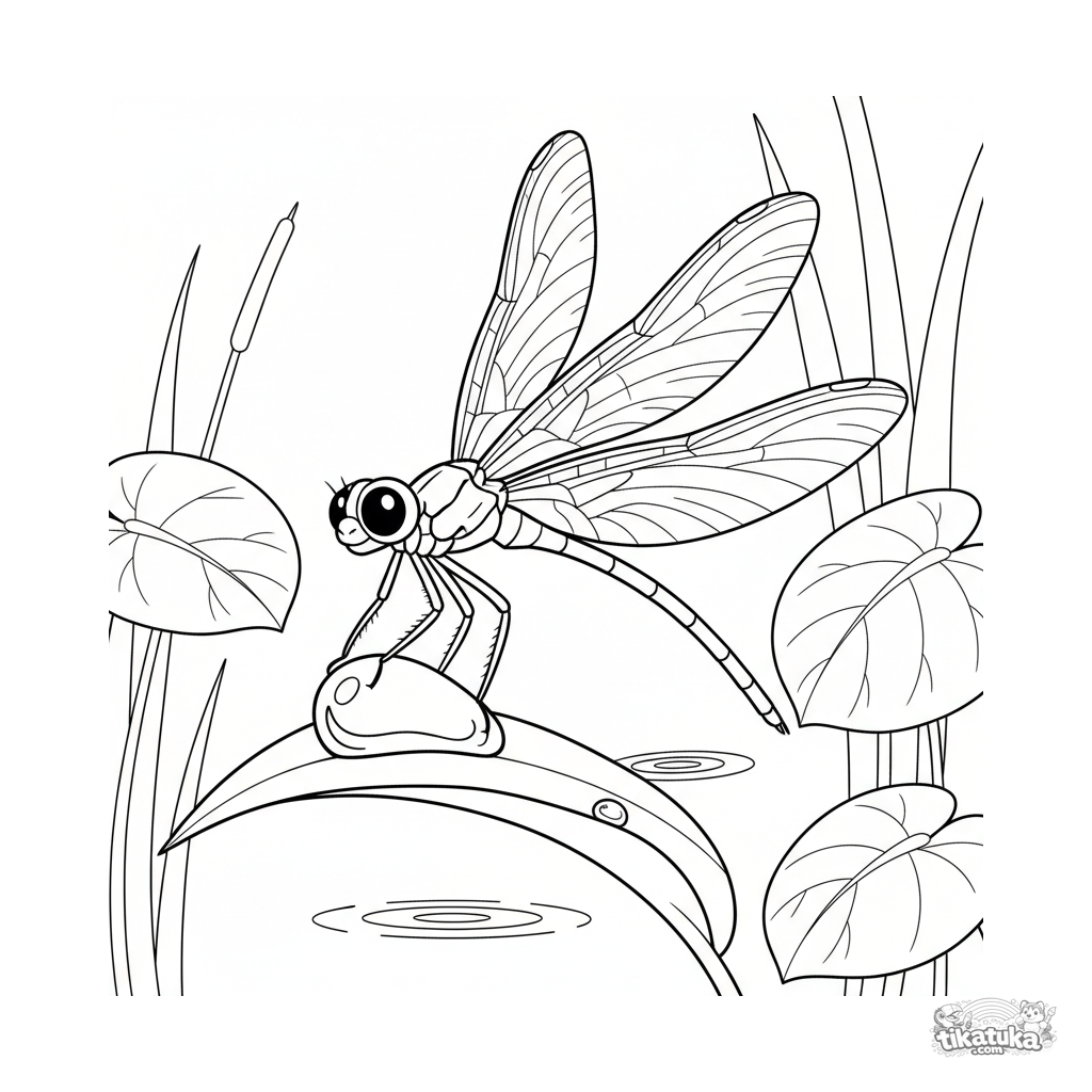 Ausmalbild für Kinder 4-6: Eine anmutige Libelle balanciert auf einem runden Tautropfen auf einem großen Blatt. Klare Umrisse.