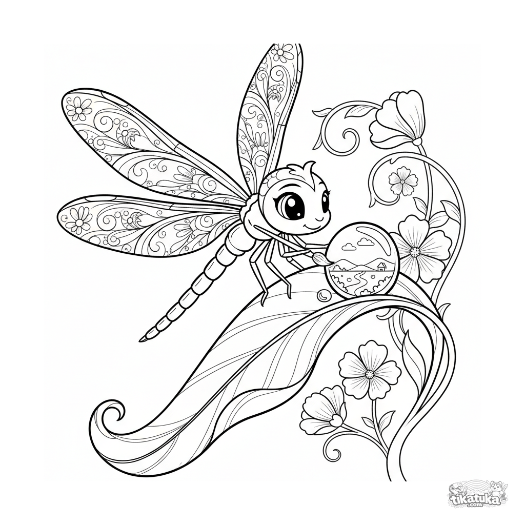 Ausmalbild für 7-9 Jahre: Eine anmutige Libelle malt eine Landschaft auf eine Tautropfen-Leinwand auf einem großen Blatt.