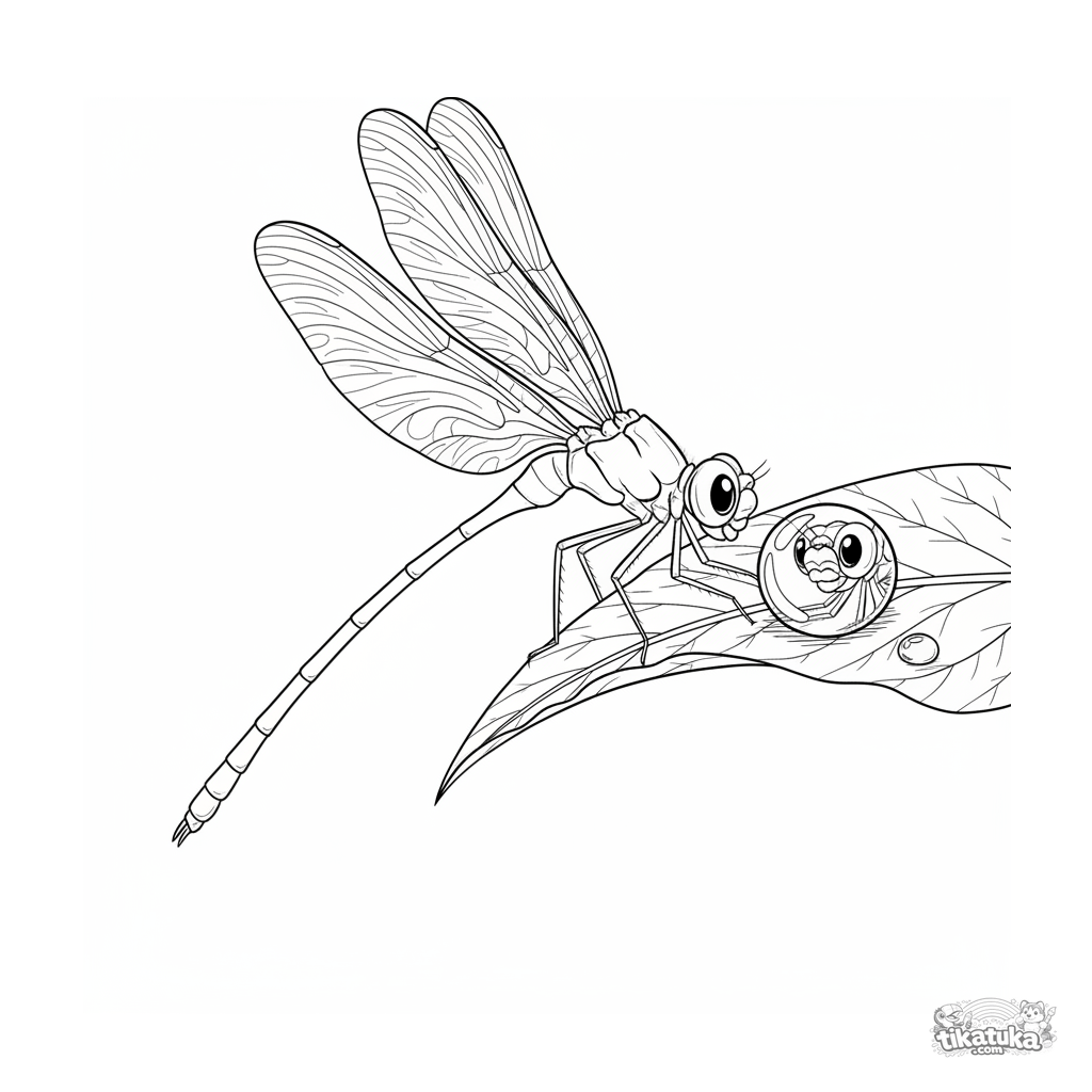 Detailliertes Ausmalbild für Kinder 10-12: eine Libelle mit gemusterten Flügeln sitzt auf einem Blattrand und schaut in einen großen Tautropfen.