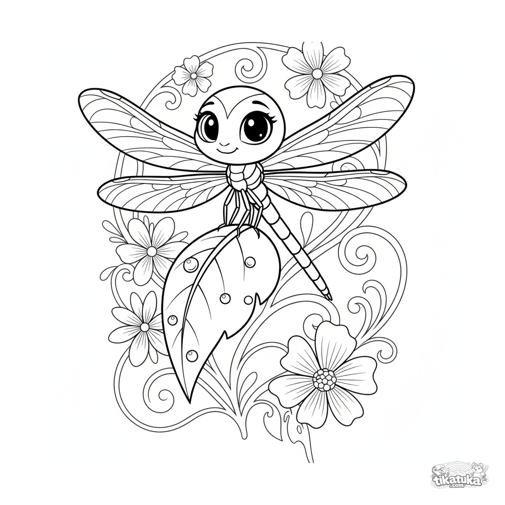 Ausmalbild für Tweens 7-9: eine anmutige Libelle sitzt auf der Spitze eines Blattes mit Tautropfen.