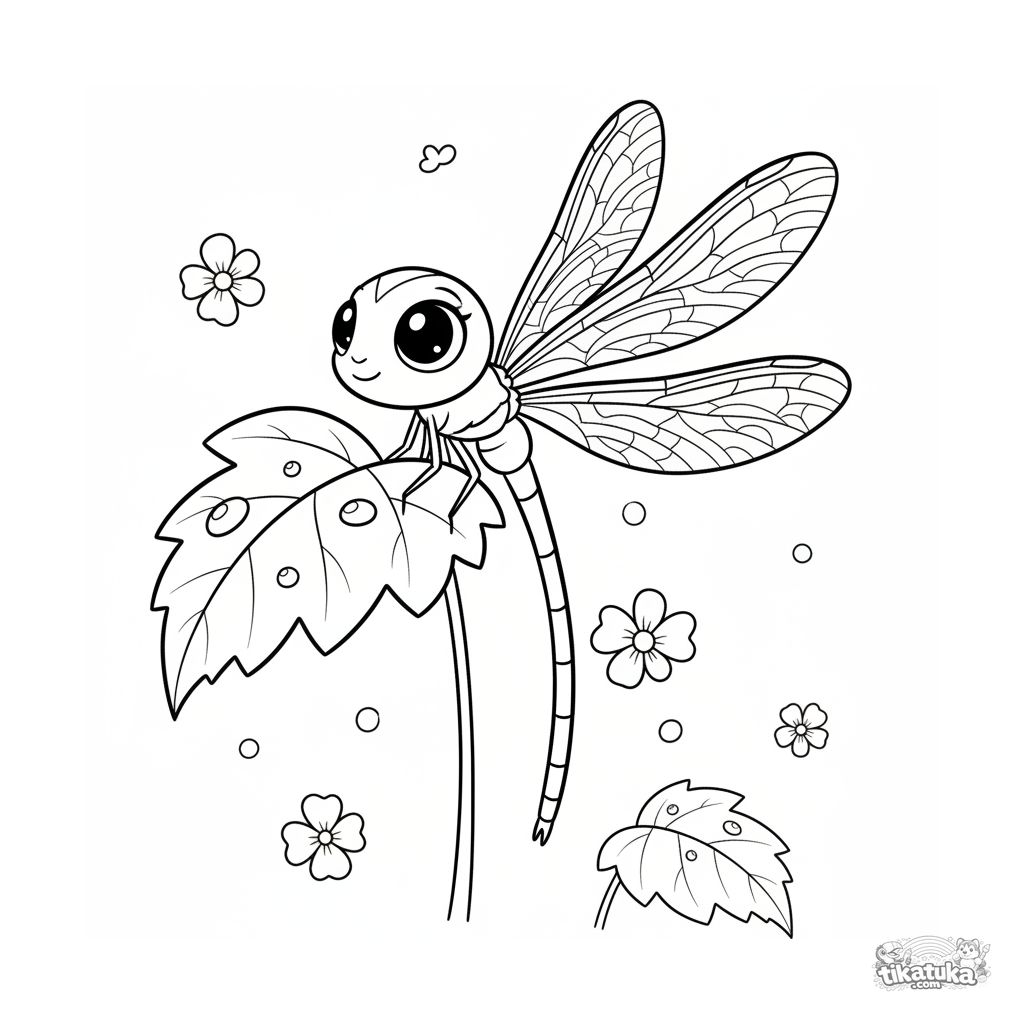 Ausmalbild für Tweens 7-9 Jahre: eine anmutige Libelle ruht auf dem Stiel eines betauten Blattes. Aquarell-Skizzen Stil, fließende Linien, ausdrucksstarke Pose.