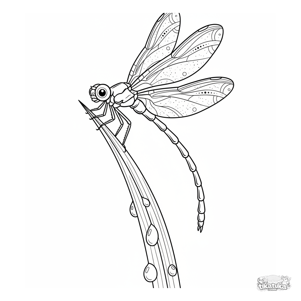 Komplexes Ausmalbild für 10-12 Jahre: Eine anmutige Libelle mit gemusterten Flügeln sitzt auf einer Blattspitze zwischen Tautropfen. Stil einer alten Grafik.
