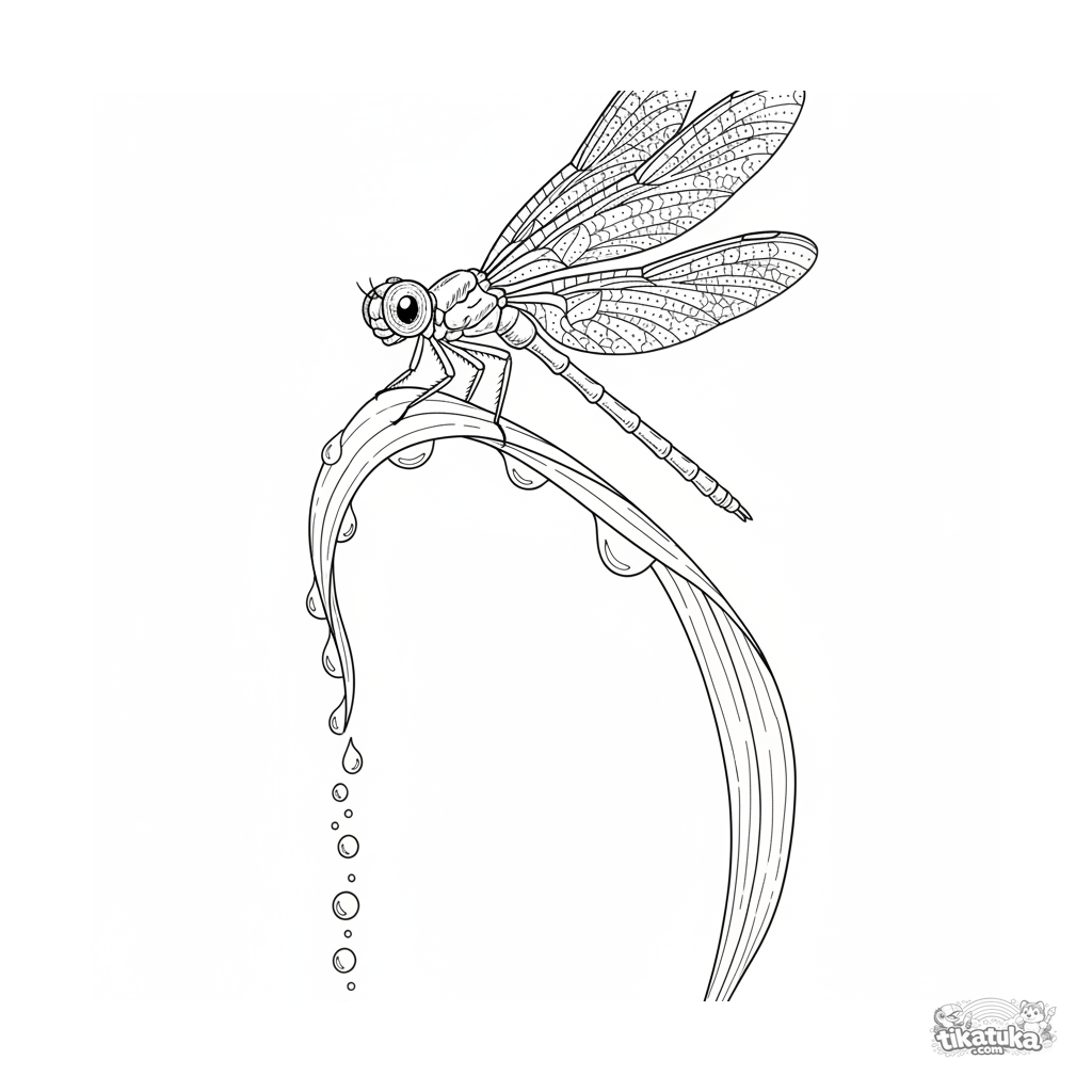 Detailliertes Ausmalbild im Stich-Stil: Eine Libelle mit spitzenartigen Flügeln sitzt auf einer Blattspitze über Tautropfen. Für 10-12-Jährige.