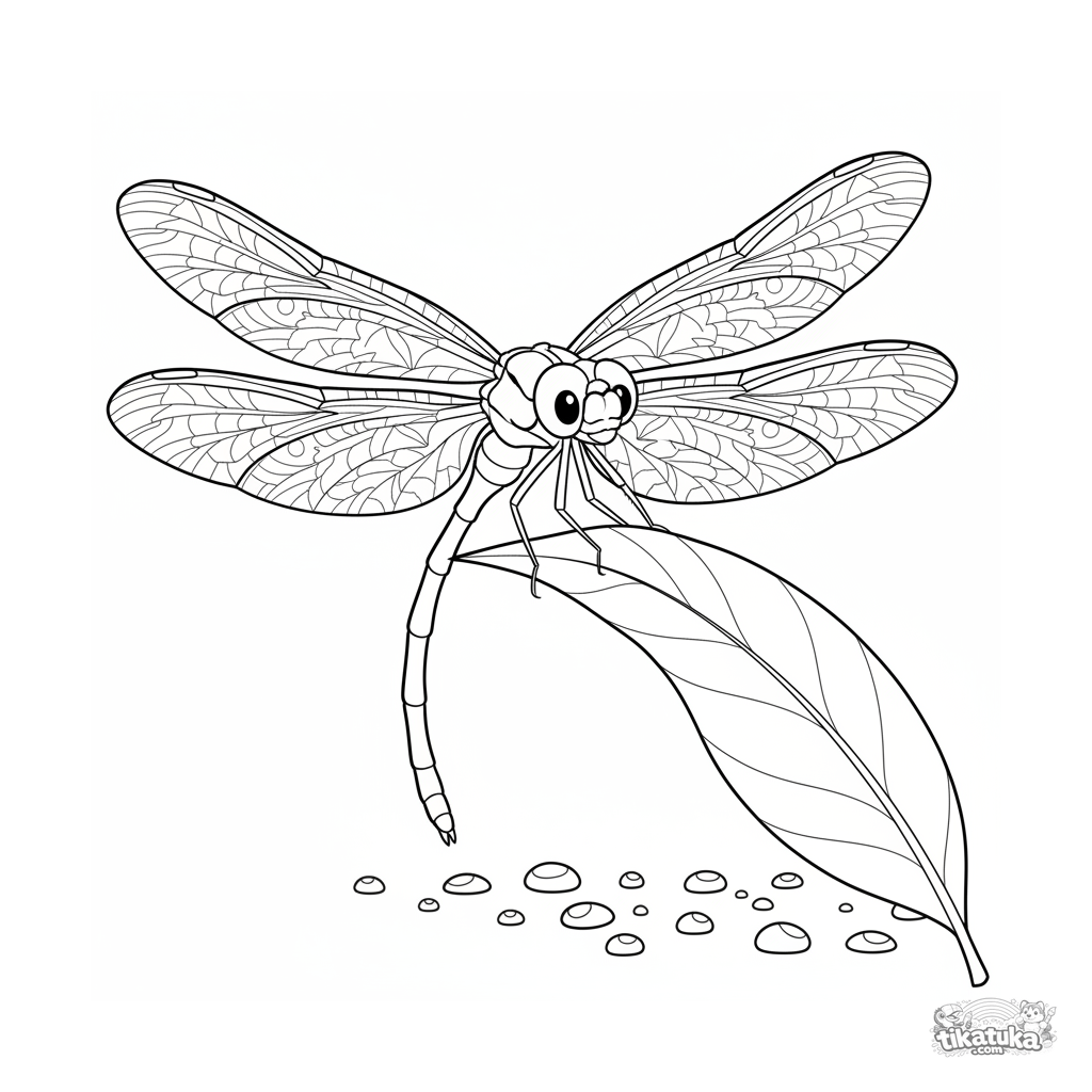 Detailliertes Ausmalbild für 10-12 Jahre: Eine Libelle mit spitzenartigen Flügelmustern sitzt auf einer Blattspitze und bewacht Tautropfen. Realistische Umrisse, komplexe Muster zum sorgfältigen Ausmalen.