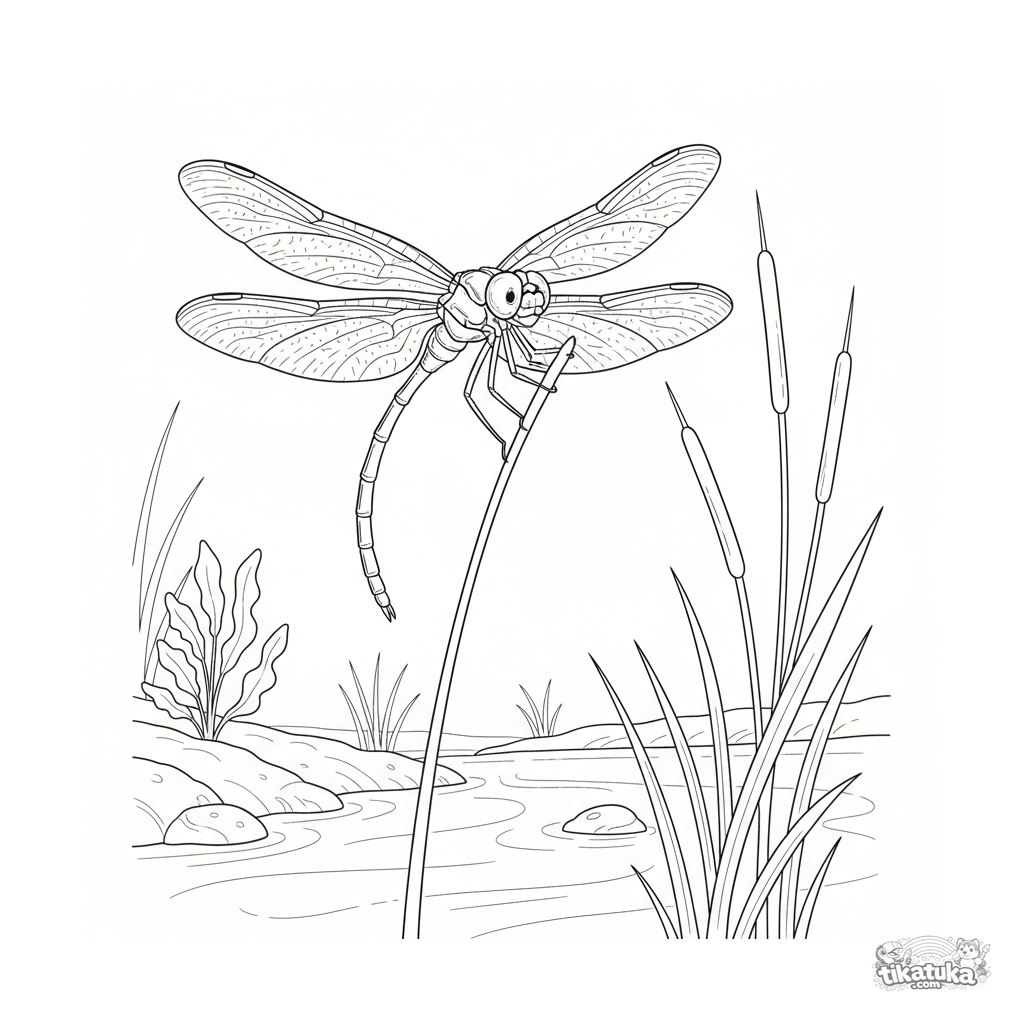 Detailliertes Ausmalbild für ältere Kinder 10-12: Eine zarte Libelle mit spitzenartigen Flügeln sitzt auf einer Schilfspitze im Sonnenlicht an einem Bach.