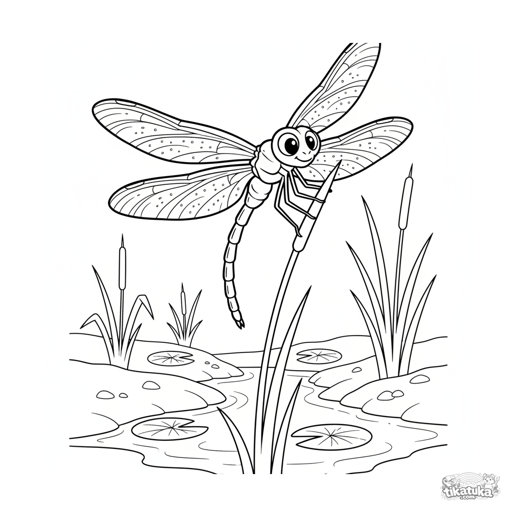 Ausmalbild für Kinder 7-9: Eine anmutige Libelle mit spitzenartigen Flügeln sitzt auf einem Schilfrohr am Bachufer. Klare Umrisse im Paper-Cut-Stil, interessante Musterdetails.