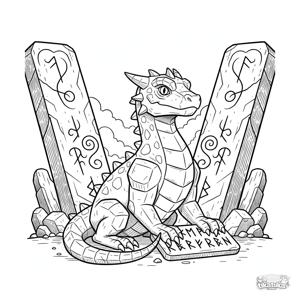 Ausmalbild für Kinder 7-9: Ein mächtiger, flügelloser Drache steht wachsam Wache am Eingang eines geheimnisvollen Kreises alter Runenmonolithen.