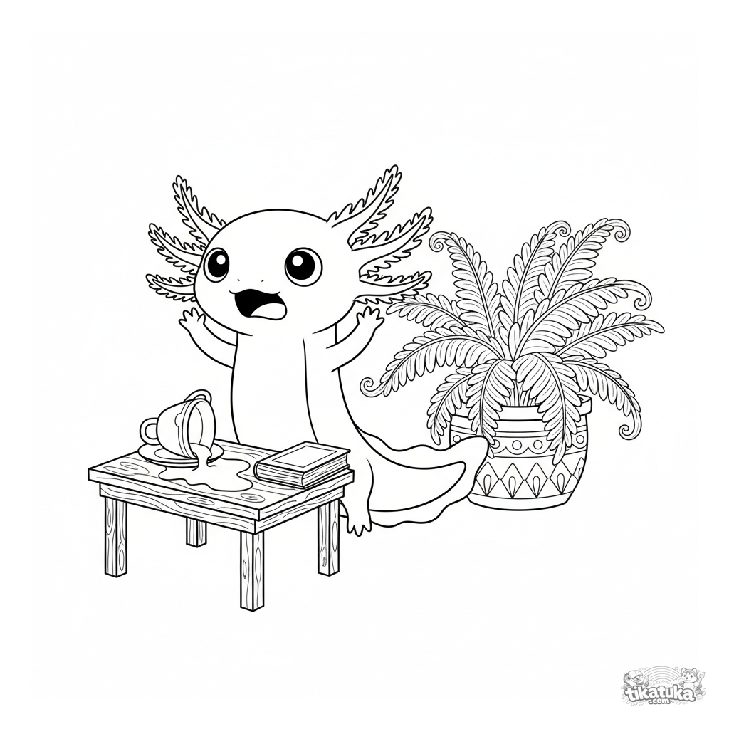 Ausmalbild für Kinder 7-12: Ein dramatischer Axolotl mit flauschigen Kiemen überreagiert auf eine verschüttete Teetasse auf einem kleinen Tisch. Übertriebene lustige Reaktionsszene.