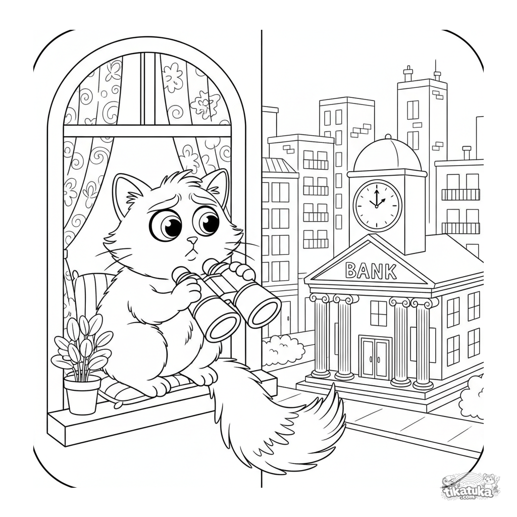 Ausmalbild für ältere Kinder: Eine dramatische, flauschige Katze mit Fernglas sucht den Zahltag von der Fensterbank aus und starrt auf eine Bank. Detaillierte Szene.