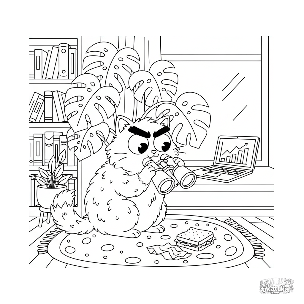 Ausmalbild für Kinder 10-12: Eine dramatische Katze späht mit Fernglas hinter einer Zimmerpflanze hervor und sucht ein Gehalt auf einem Laptop. Lustige, detaillierte Szene.
