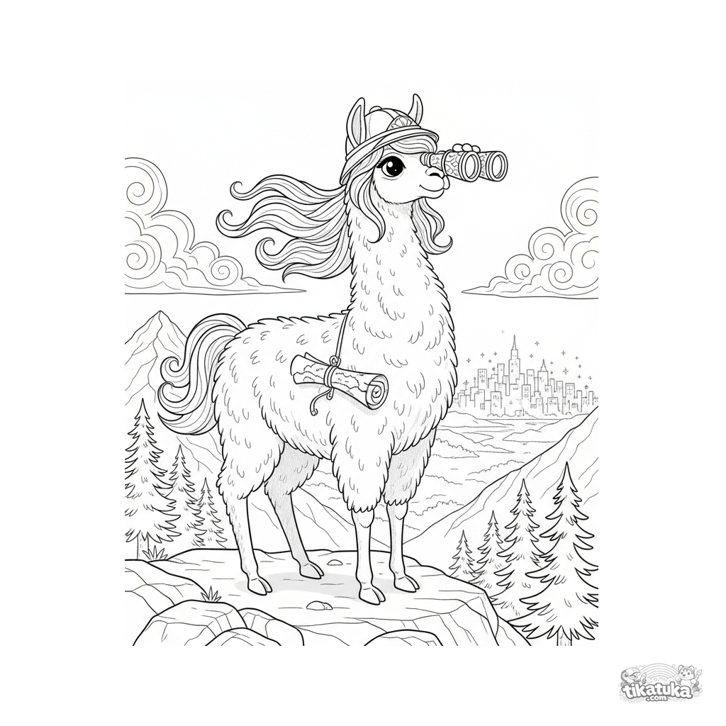 Ausmalbild für Kinder von 10-12 Jahren: Ein dramatisches Entdecker-Lama auf einem Berggipfel benutzt ein Fernglas, um eine ferne Stadt zu betrachten, in der sein Gehalt wartet. Detaillierte Landschaft im märchenhaft-realistischen Stil.