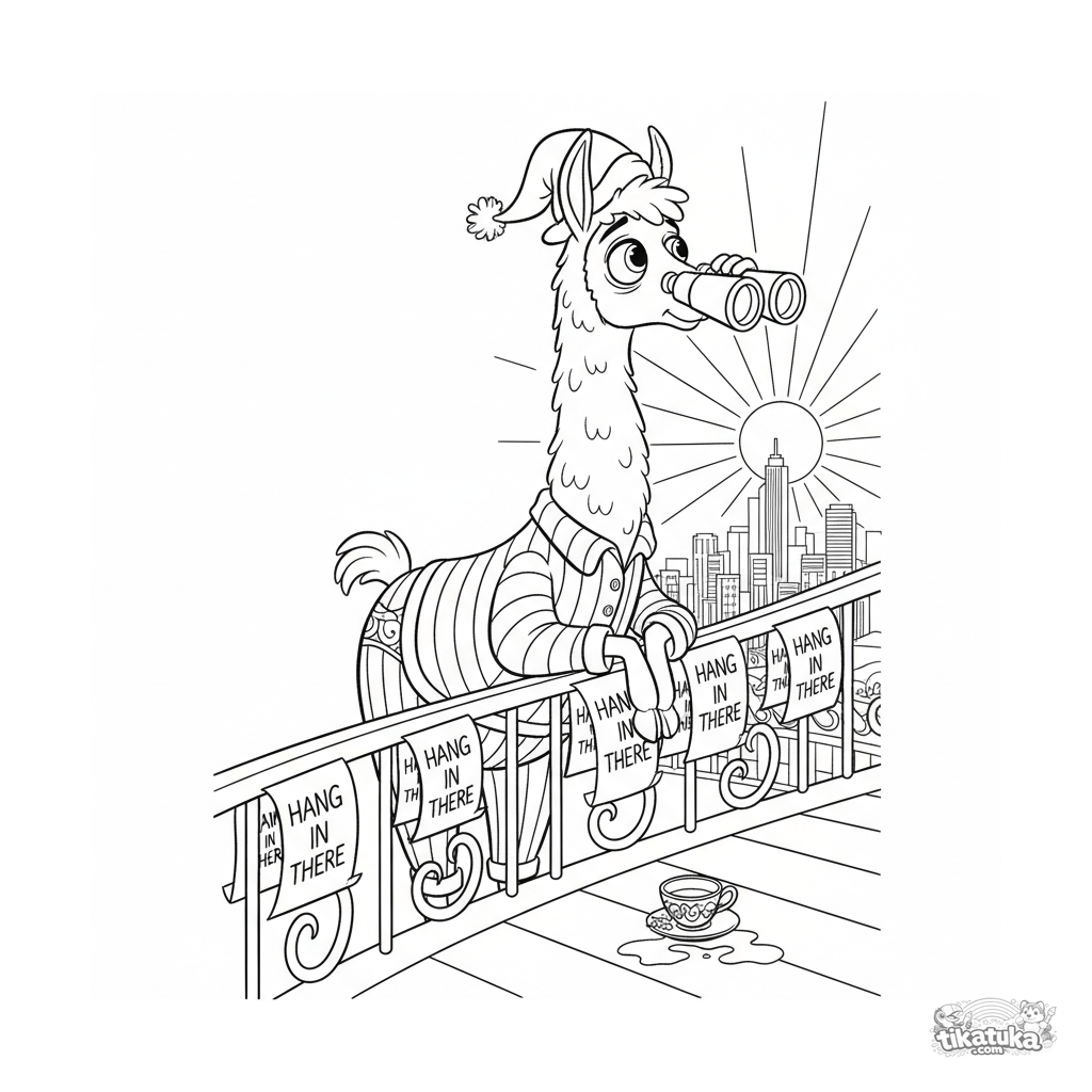 Ausmalbild für Kinder 10-12: Ein erschöpftes, dramatisches Lama im Schlafanzug auf einem Balkon mit Fernglas, beobachtet den Sonnenaufgang.