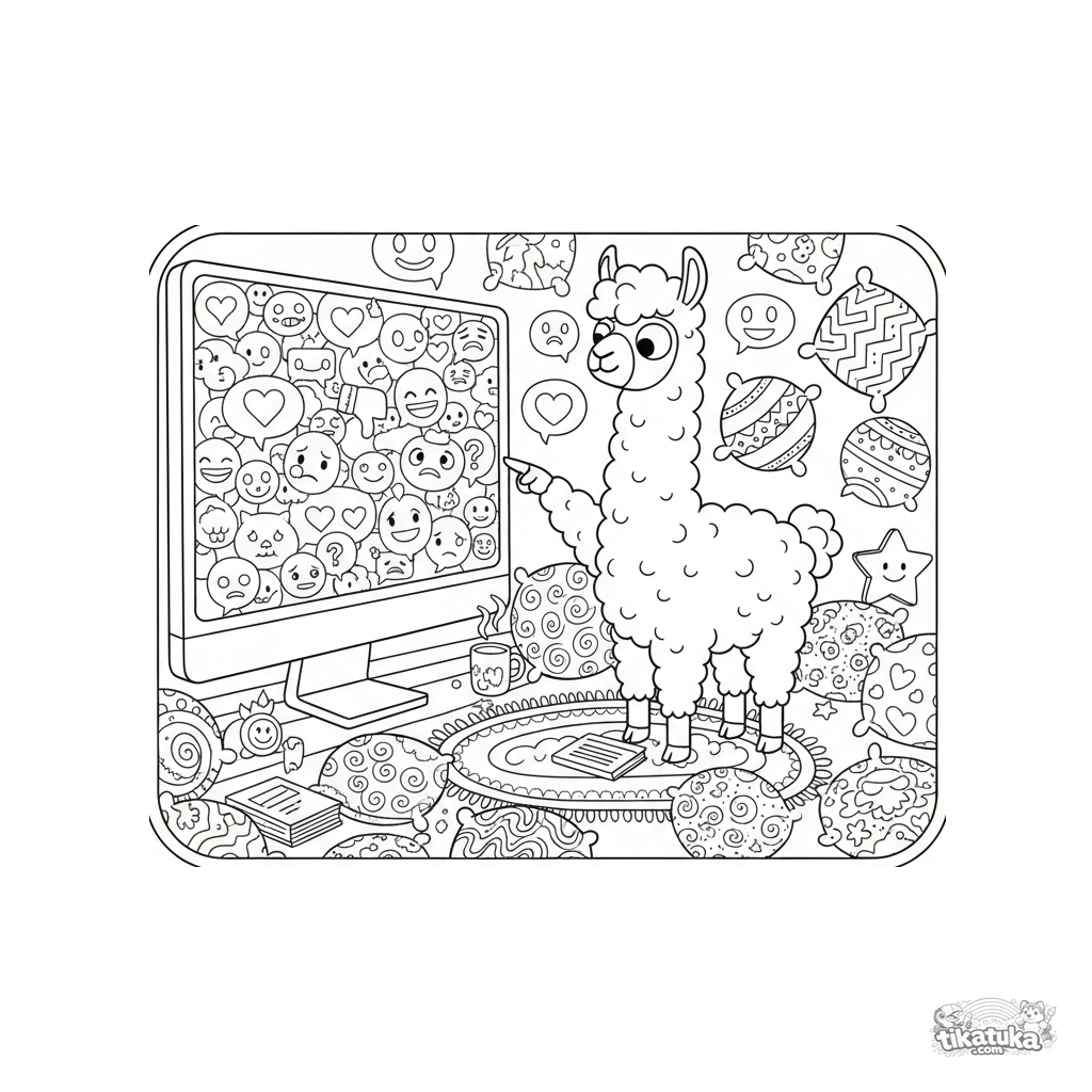 Ausmalbild für Kinder 7-12: ein dramatisches Lama zeigt auf einen chaotischen Chat auf einem riesigen Monitor. Lustige und detaillierte Szene im Comic-Abenteuer-Stil.