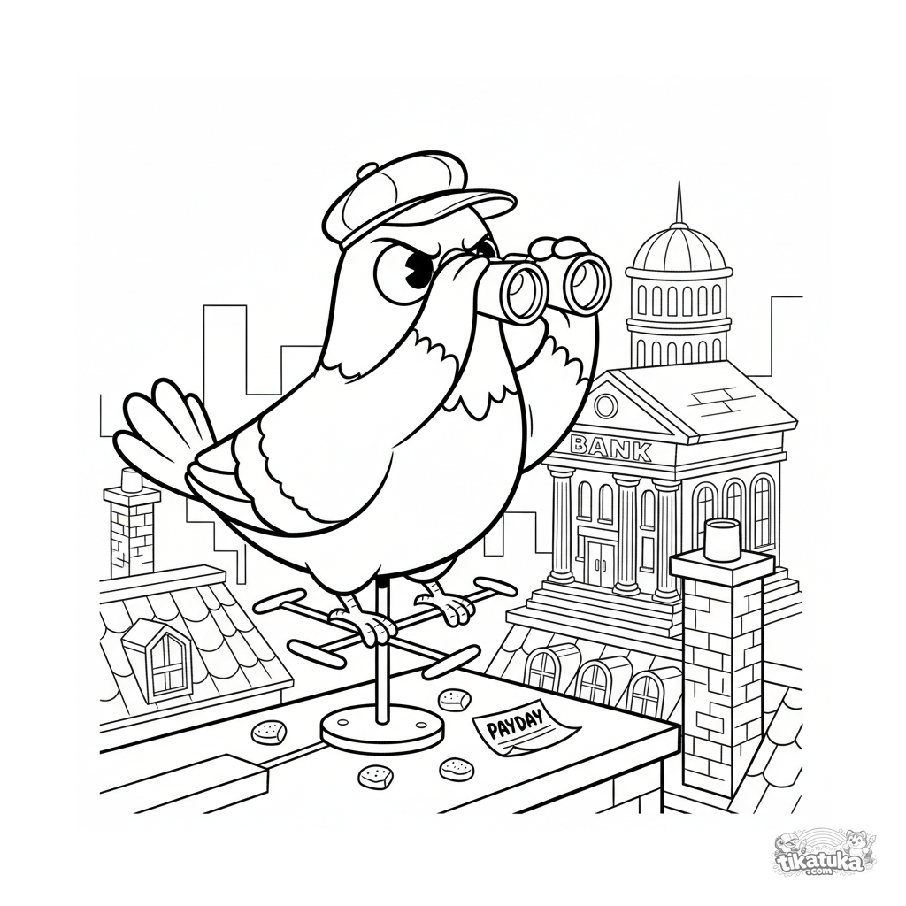 Ausmalbild für Kinder 10-12: Eine dramatische Taube auf einem Dach sucht mit einem Fernglas den Gehaltstag. Detaillierte, lustige Szene im Retro-Stil.