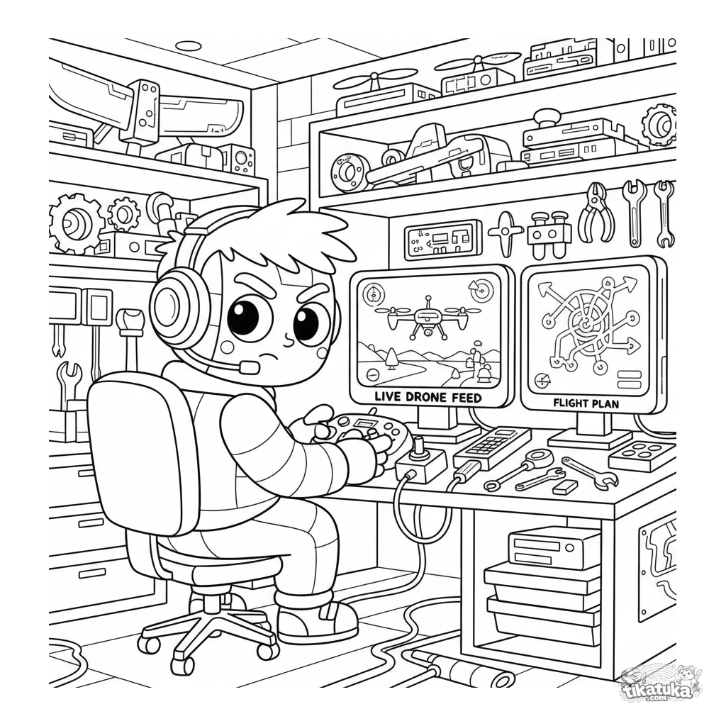 Ausmalbild für 10-12 Jahre: Ein Drohnen-Operator steuert von einer Keller-Kontrollstation aus. Details: Joystick-Controller, Live-Bildschirme, Karte, Ersatzteile.