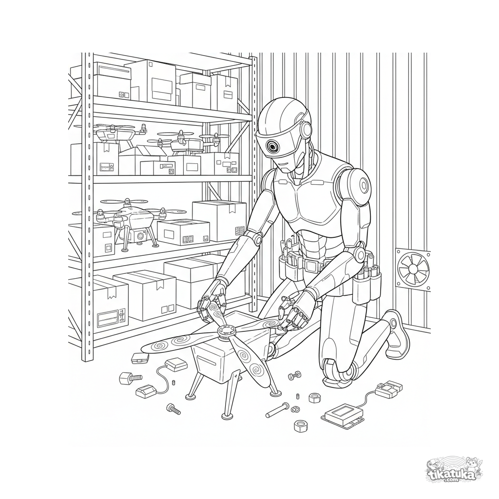 Detailliertes Ausmalbild für 10-12 Jahre: ein Mechaniker-Roboter im Stil einer wissenschaftlichen Illustration repariert eine Drohne in einem Lagerhaus zwischen Ersatzteilkisten.