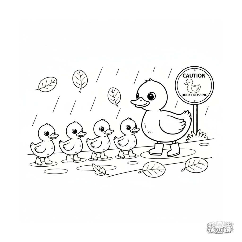 Ausmalbild für Kleinkinder 2-3 Jahre: eine Familie flauschiger Entenküken in Stiefeln überquert eine nasse Straße im Herbstregen. Sehr einfache Formen, große Flächen.