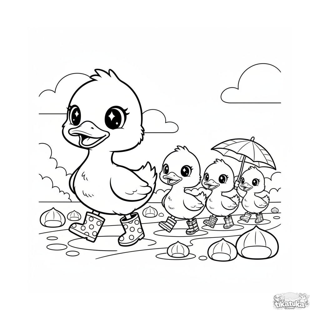 Ausmalbild für Kleinkinder 2-3 Jahre: eine Familie flauschiger Entenküken in winzigen Stiefeln watschelt in einer Reihe auf einem nassen Parkweg im Regen. Sehr einfache, große Formen.
