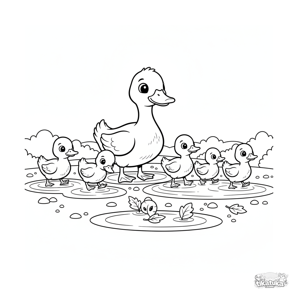 Ausmalbild für Kinder 7-9: Eine Mutterente führt eine Reihe flauschiger Entenküken auf einem nassen Kiesweg mit Pfützen während eines leichten Herbstregens.