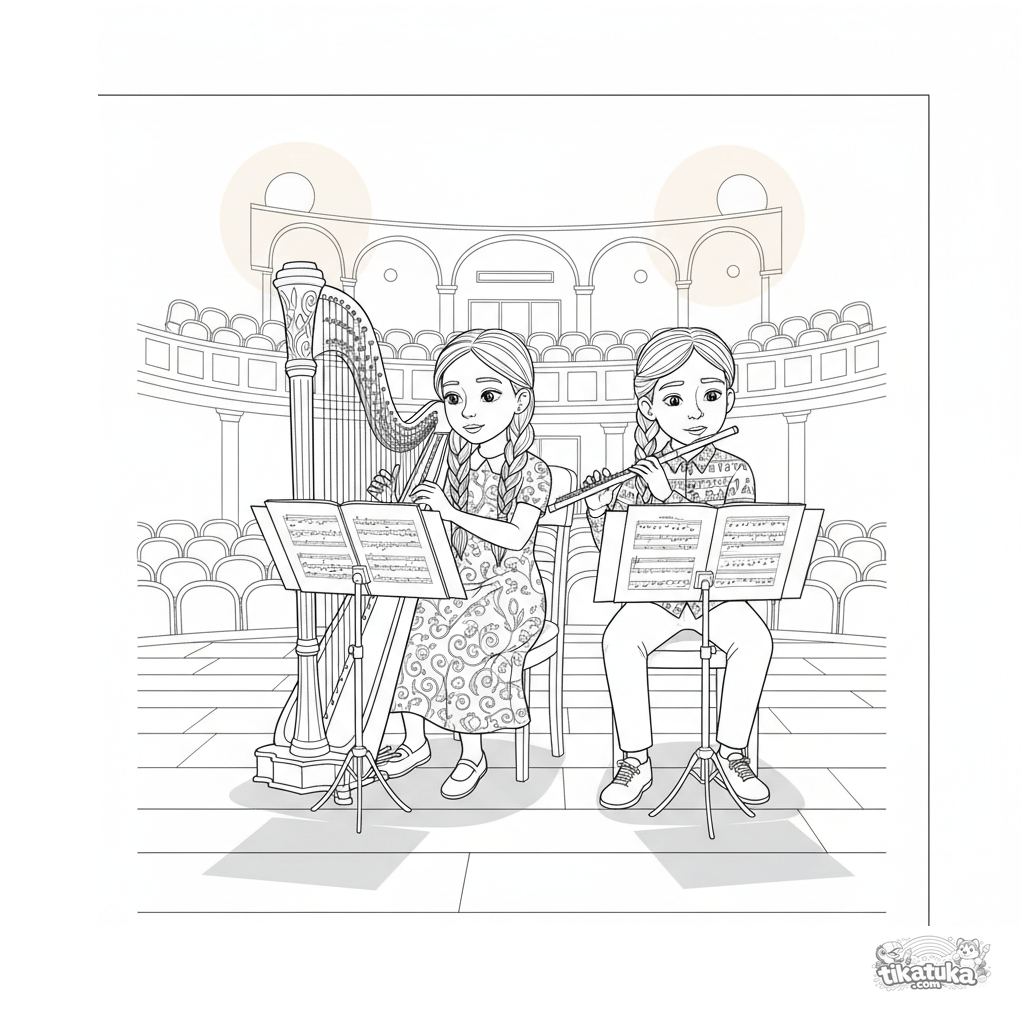 Komplexes Ausmalbild für 10-12-Jährige: Ein Duo junger Musiker spielt Harfe und Flöte auf einer großen Konzerthallenbühne.