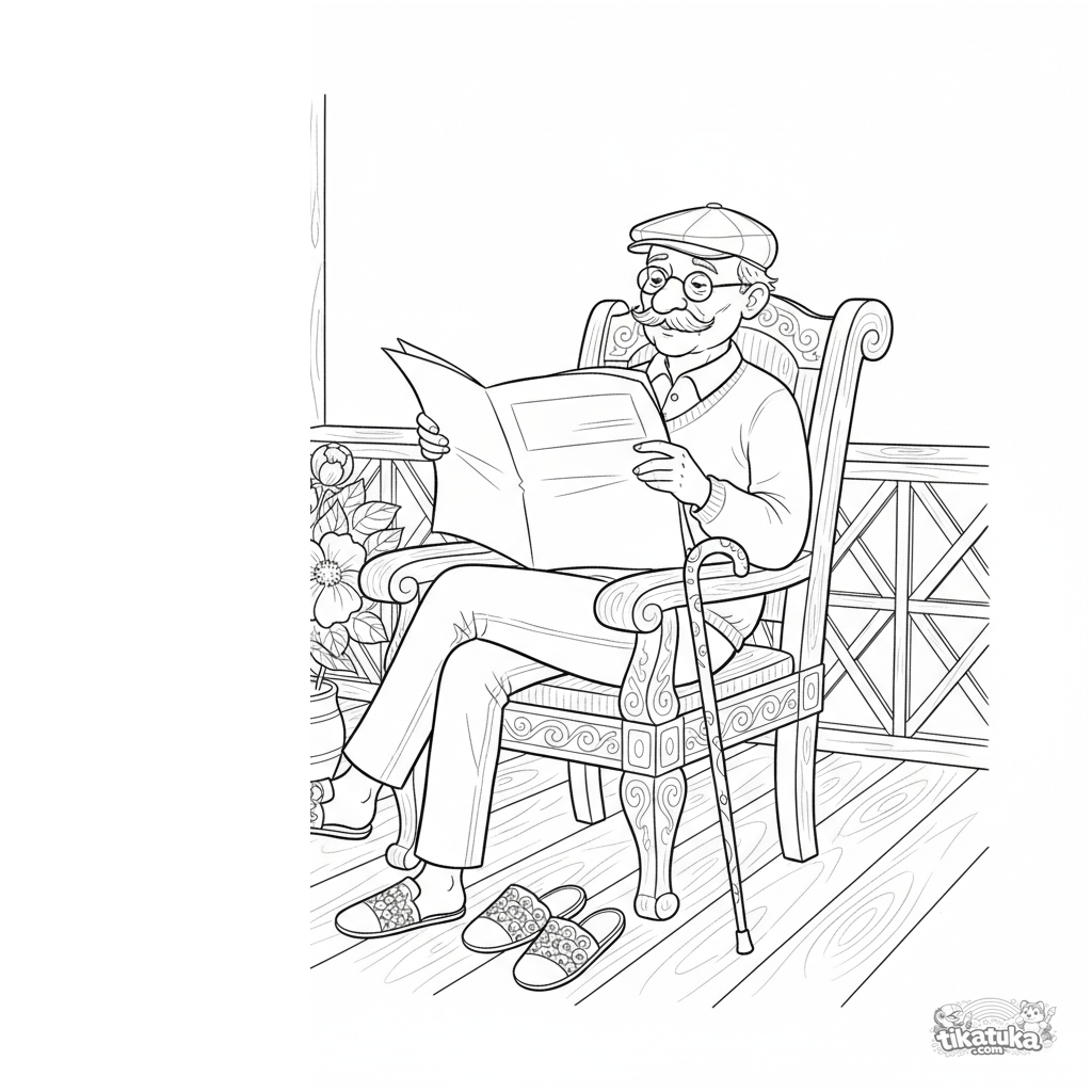 Detailliertes Ausmalbild für Kinder 10-12: Ein Opa mit Brille liest eine Zeitung in einem Sessel auf der Veranda.