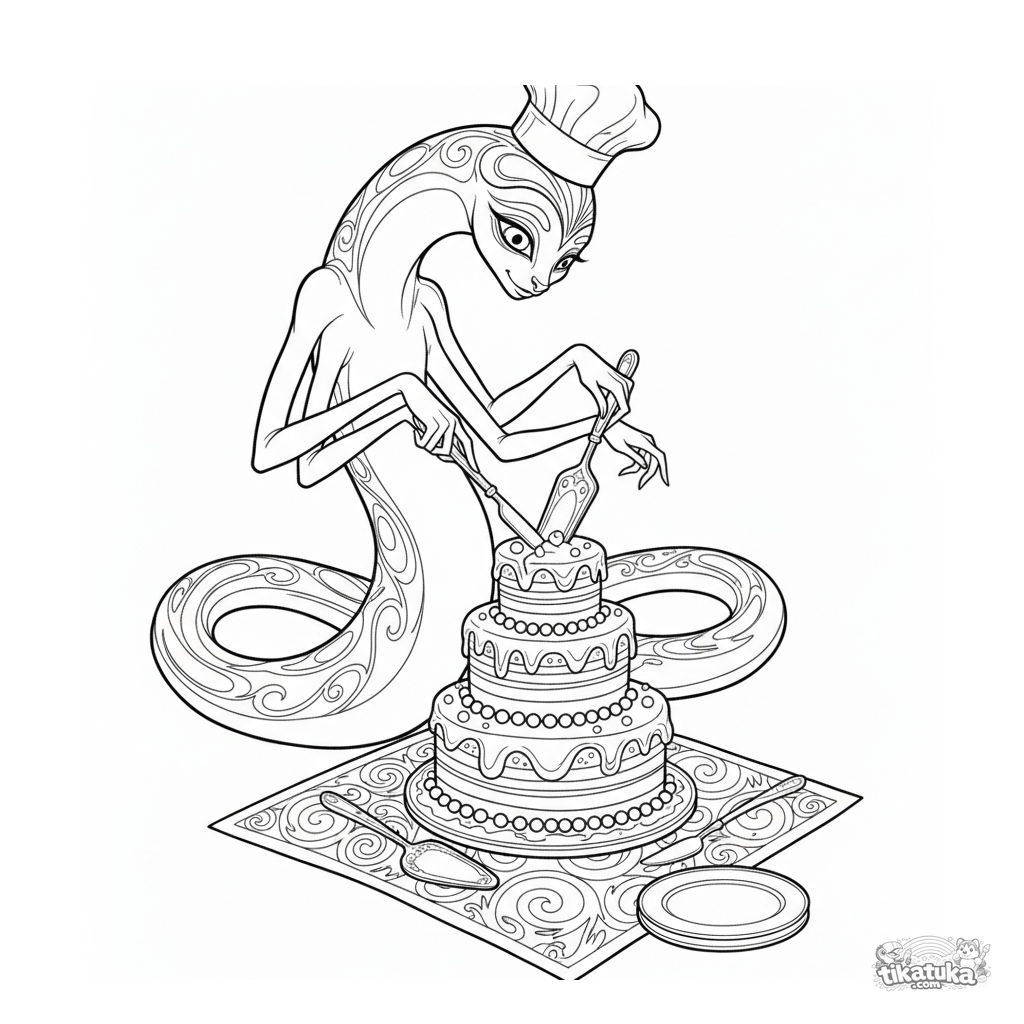 Detailliertes Ausmalbild für 10-12 Jahre: ein elegantes, mehrarmiges Monster mit Kochmütze schneidet einen Festtagskuchen auf einem Picknick. Komplexe Linien und Verzierungen.