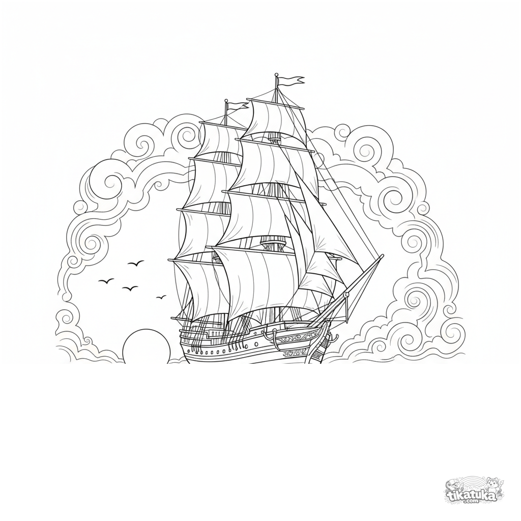 Detailliertes Ausmalbild für ältere Kinder 10-12: Ein majestätischer Großsegler mit vollen Segeln gleitet auf einem ruhigen Meer bei Sonnenuntergang, mit Spiegelung auf dem Wasser und entfernten Seevögeln.