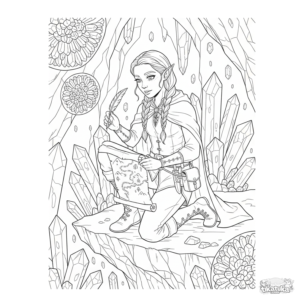 Ausmalbild für ältere Kinder 10-12: Ein Elben-Späher in Lederausrüstung kartiert eine leuchtende Höhle voller riesiger Kristalle. Detaillierte und abenteuerliche Fantasieszene.