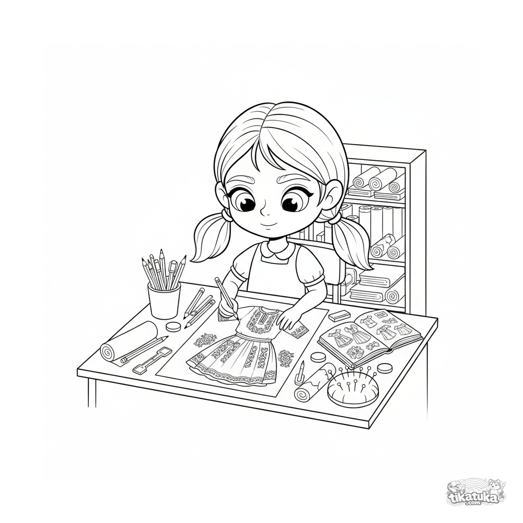 Kreatives Ausmalbild für 10-12 Jahre: Ein Mädchen entwirft eine Volkstracht-Skizze an ihrem Zeichentisch. Doodle-Notizbuch-Stil, viele Details des kreativen Prozesses.