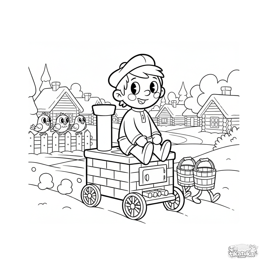 Lustiges Ausmalbild von 'Auf Geheiß des Hechts'. Emelya fährt auf seinem Zauberofen durch das verschneite Dorf. Für Kinder von 4-6 Jahren.