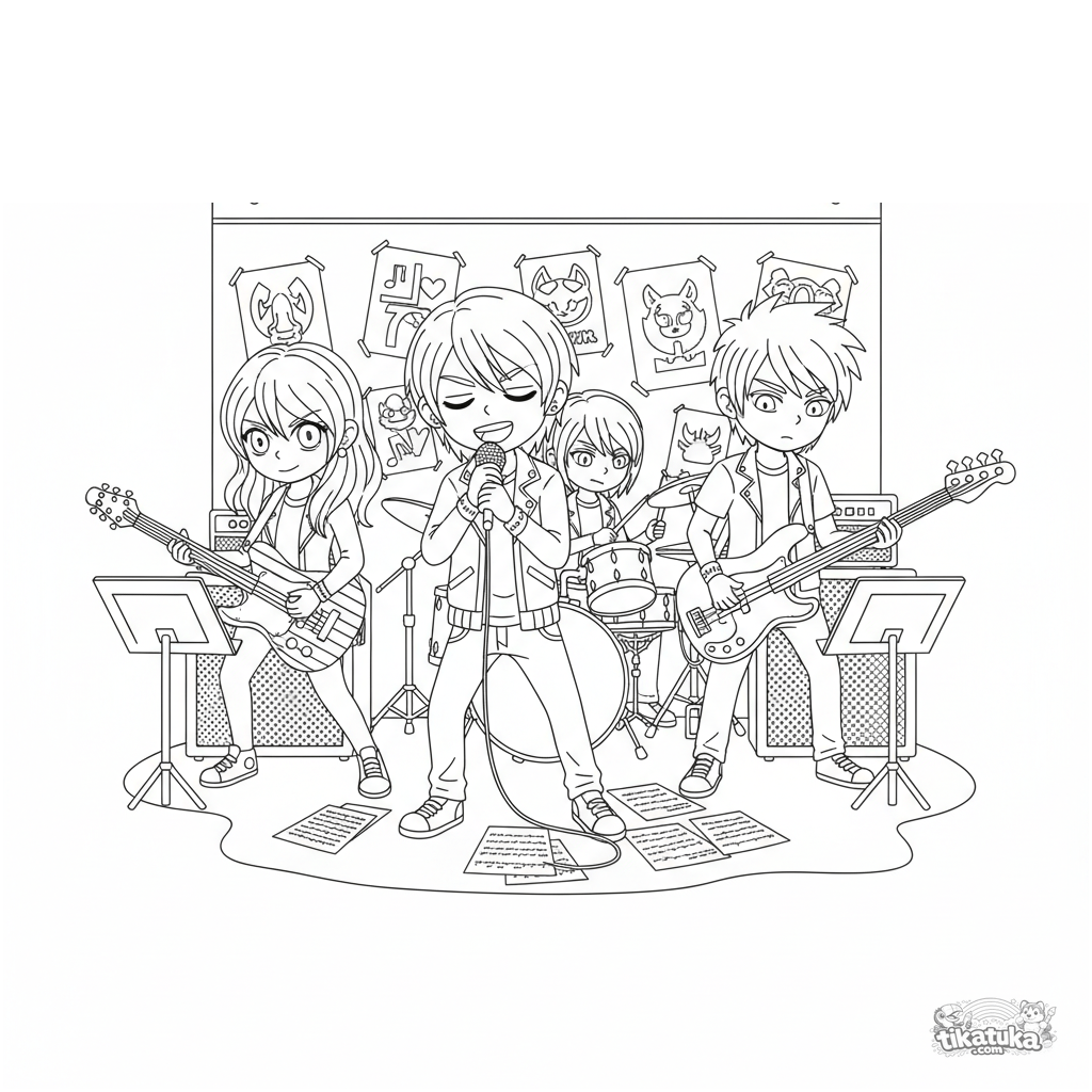 Ausmalbild für Kinder von 7 bis 12 Jahren: Eine Emo-lite-Band probt in einem gemütlichen Musikclub. Viele Details: Instrumente, Poster, Notenblätter. Szene für geduldiges Ausmalen.